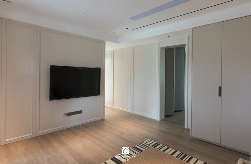背景墻采用可可蛋奶色混油護墻板