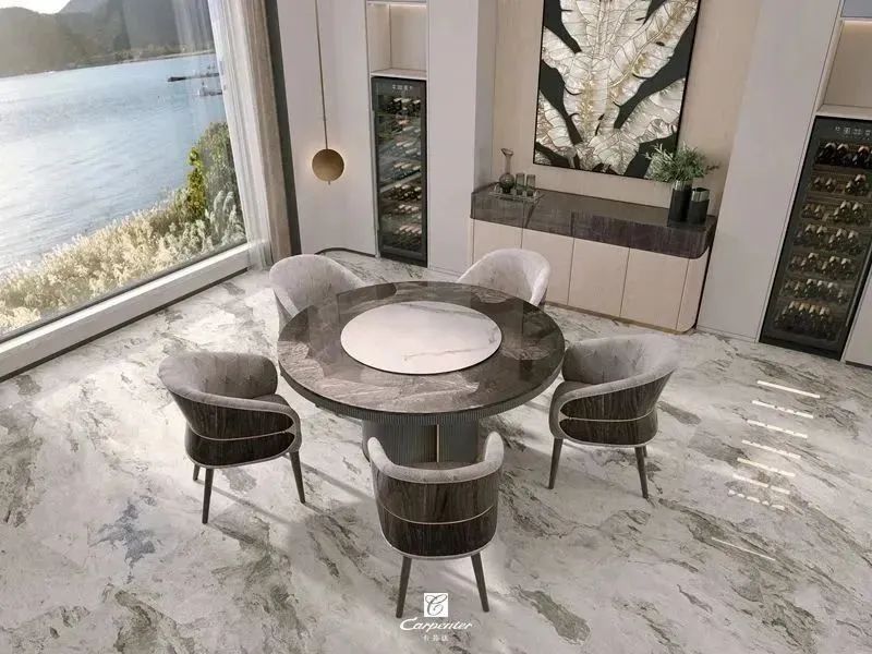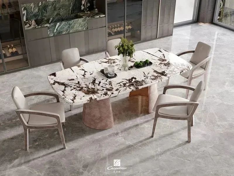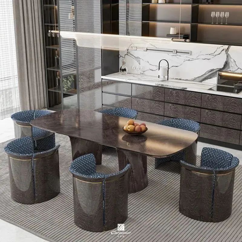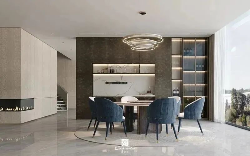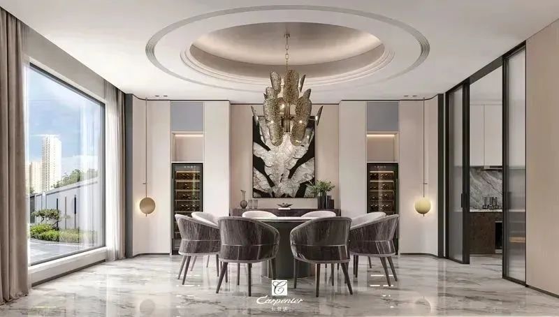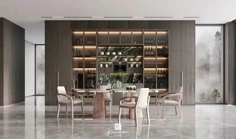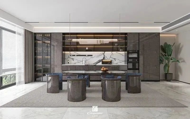 設計師通過材質選擇、色彩運用和軟裝搭配,演繹高級輕奢風。注重空間與功能的結合,餐邊柜、酒柜及餐桌椅井然有序、整齊劃一,滿足用餐、收納、展示等多重需求。