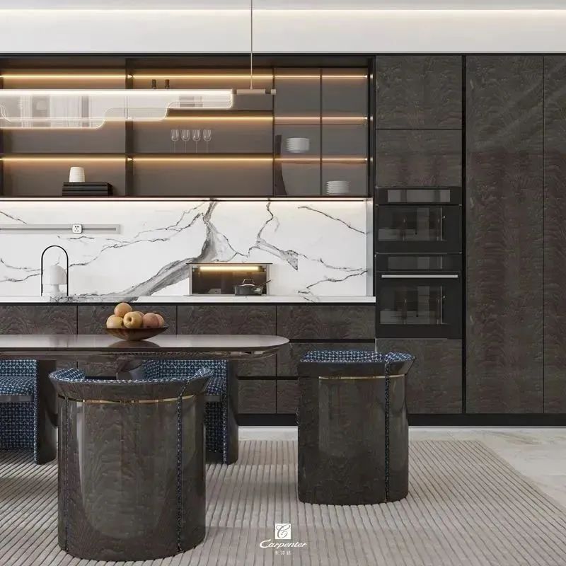 深棕色亮光的定制柜、金邊點綴的餐桌椅、間隔使用的玻璃門,細節中透露著浪漫,打造高級精致的輕奢風餐廳,營造情調十足的用餐氛圍,用餐也自帶精英范兒。